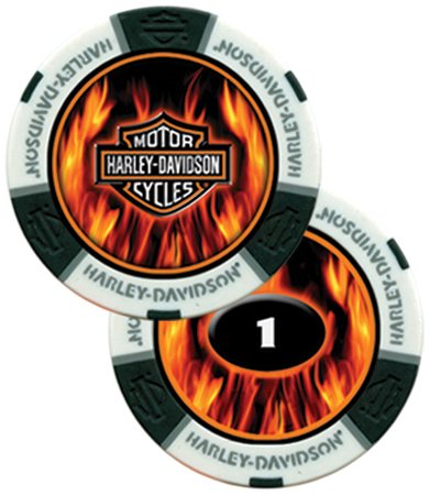 This Harley Davidson Flame Poker Chip comes in white color, weighs 11.5 gramsand is made out of acrylic. This casino style chip features a flame graphic with the HD logo on one side andon the other side a flame graphic with the number 1 representing it's denomination. This chip also features the Harley Davidson name print all around the edge along with an engraved HD shieldlogo. Bet in style with the Harley Davidson Flame Chip and represent yourfavorite motorcycle brand.
