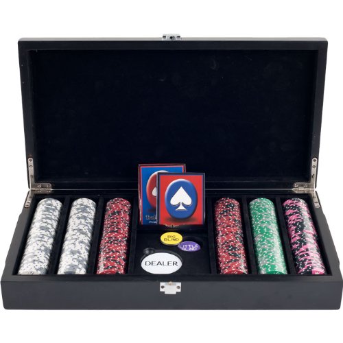 - chips are decorated with three different combinations of double dice on the outer rim, along with three separate crown , interior is lined with black fabric with space for 300 chips and two decks of cards, a dealer button, a big and little blind